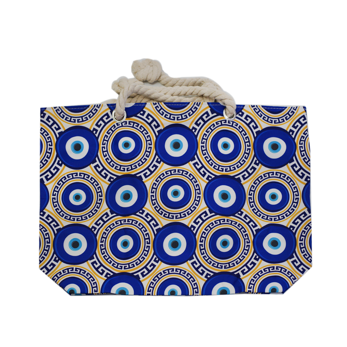 Bolsa de mano grande con estampado de ojo turco. Asa de cuerda, diseño llamativo y espacio ideal para llevar lo que necesites.
