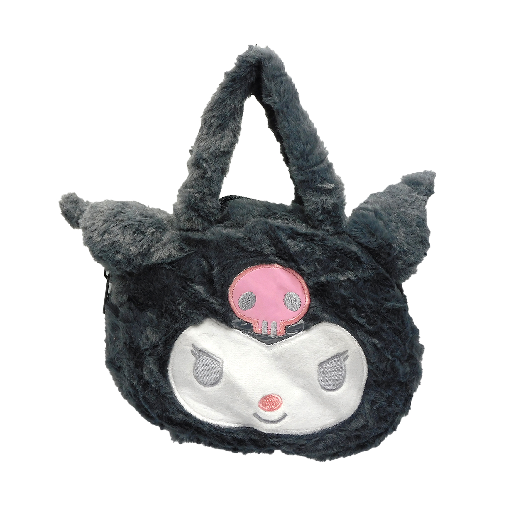 Bolso peluche Kuromi en forma de su cabeza. Suave, compacto y perfecto para complementar tu estilo kawaii.
