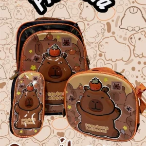Mochila con divertido diseño de capibara, incluye lonchera y lapicera a juego. Alta calidad y perfecto para el regreso a clases.