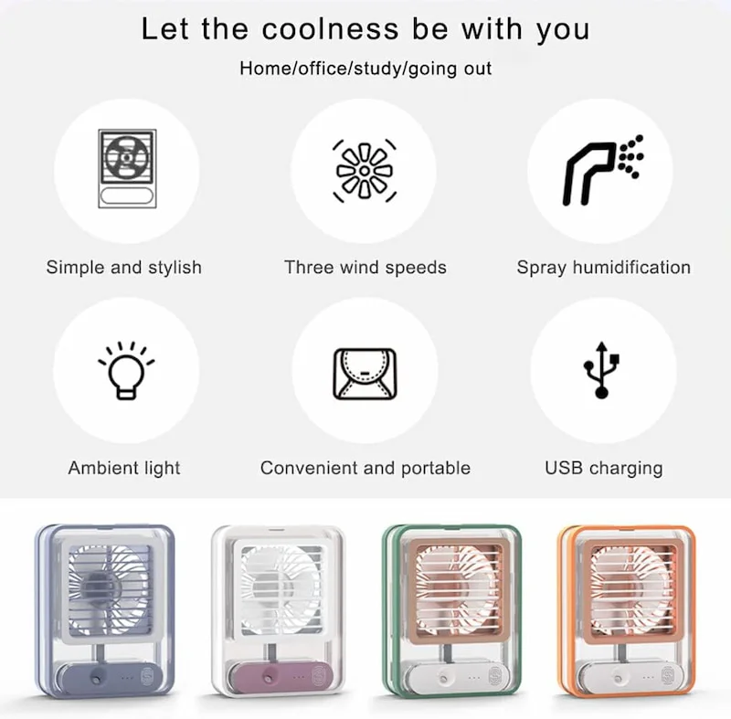 Mini ventilador de escritorio recargable con enfriador de aire y función de niebla. Silencioso y portátil, es perfecto para la escuela, la oficina y otros espacios pequeños. Proporciona una brisa fresca y cómoda con una operación fácil y eficiente.
