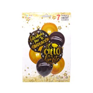 Set de 7 globos para graduación. Incluye 5 de látex y 2 metálicos con diseños variados. Ideal para decoración de fiestas.