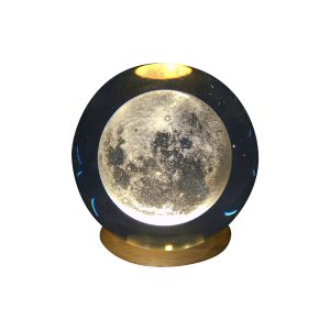 Lámpara de mesa con bola de cristal grabada internamente y base de madera, iluminada con luz LED. Su diseño elegante y moderno crea un ambiente acogedor, ideal para cualquier espacio. La combinación del cristal grabado y la cálida base de madera aporta un toque decorativo único y sofisticado, perfecto para hogares u oficinas.