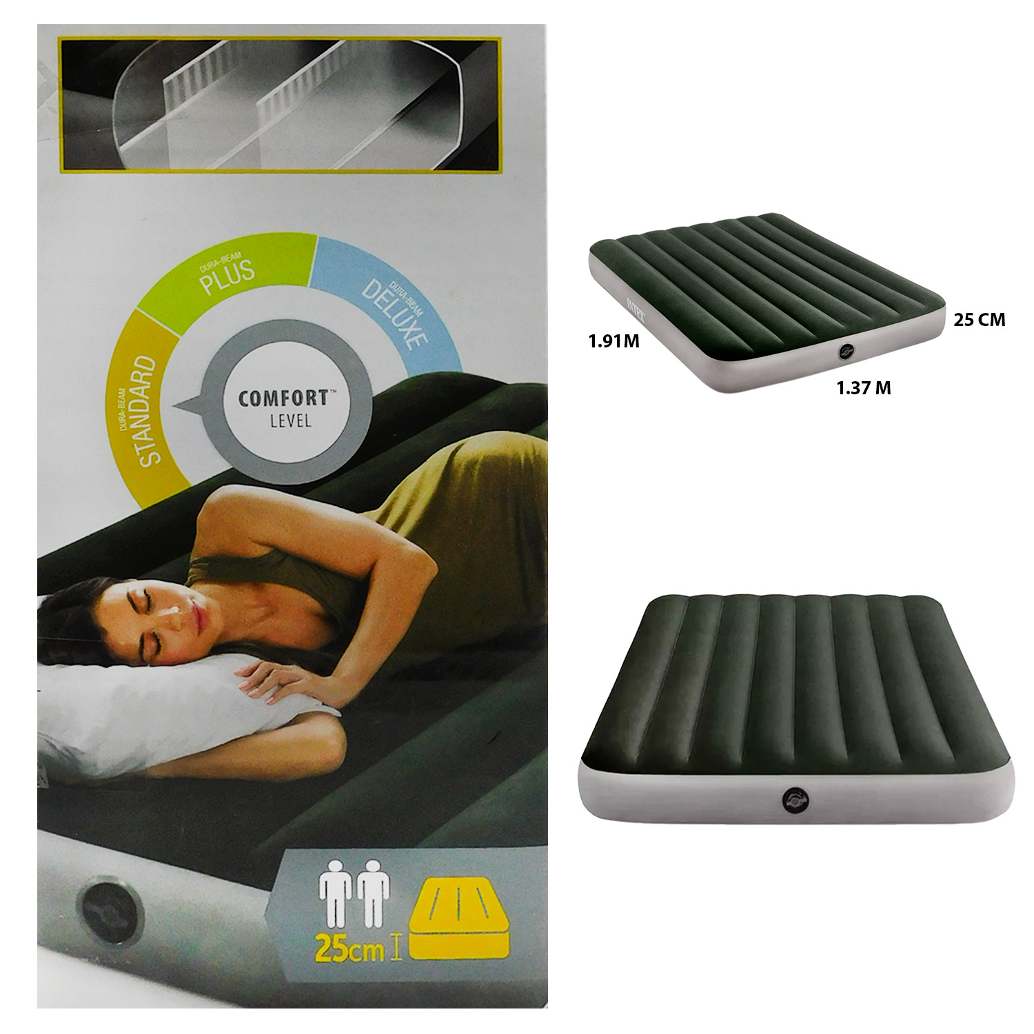 Colchón inflable resistente y cómodo de 1.37×1.91×25 cm. Soporta hasta 272 kg. Ideal para uso en casa, viajes o campamentos.