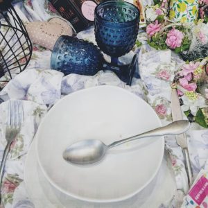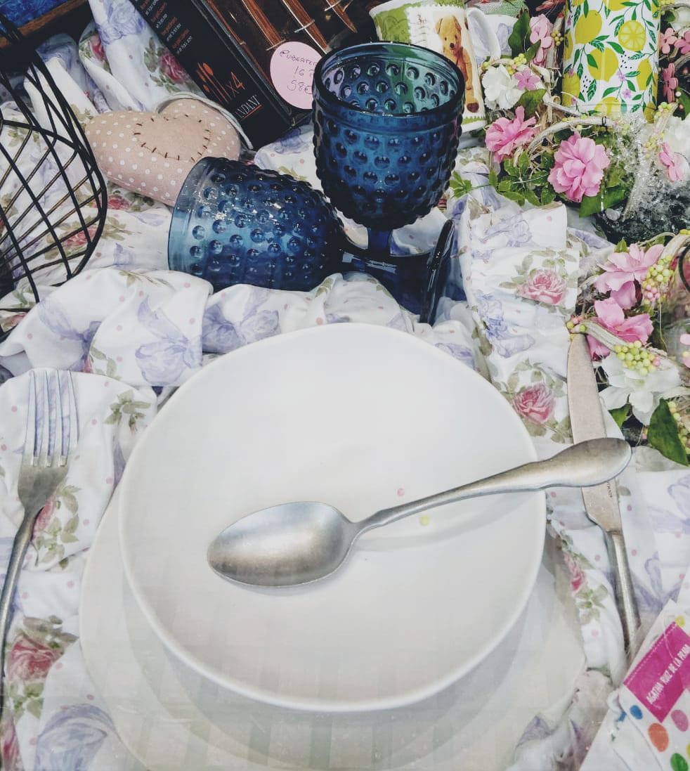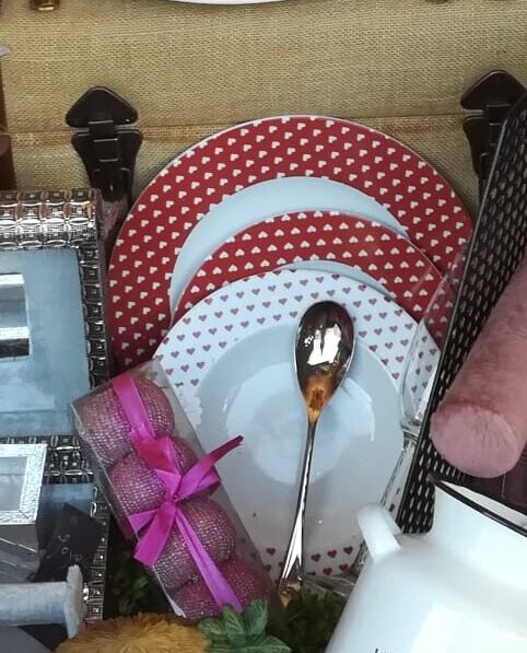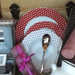 Vajilla combinada con seis decoraciones y seis servicios: seis platos llanos, seis platos hondos y seis platos de postre. Tres platos de cada modelo que aparece en la fotografía.