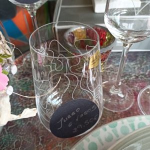 Juego de seis copas de cristal con decorado en círculos y azul intenso.
