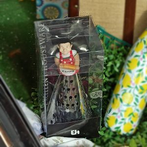 Rallador tamaño grande, de acero inoxidable con decoración de cocinero italiano, y diferentes zonas de rallado en forma cónica.