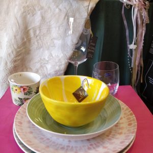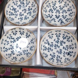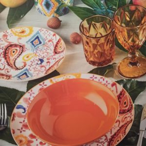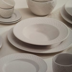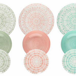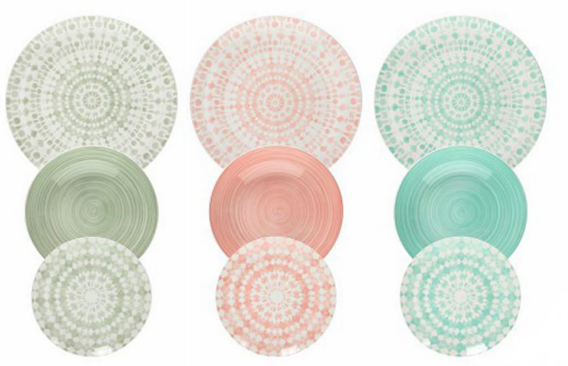 Vajilla combinada en tres colores con seis servicios: seis platos llanos, seis platos hondos y seis platos de postre. Dos platos de cada modelo que aparece en la fotografía.