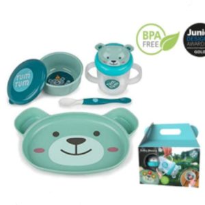 Incluye plato con ventosa para evitar caídas, cuchara doble de dos tamaños, tupper redondo y taza infantil con asas anti derrame. Material libre de BPA y sustancias tóxicas.