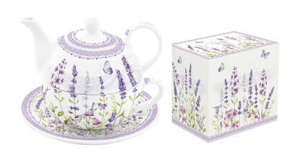 Set de té de porcelana compuesto por tetera, taza y plato para un servicio. Colección Lavanda.