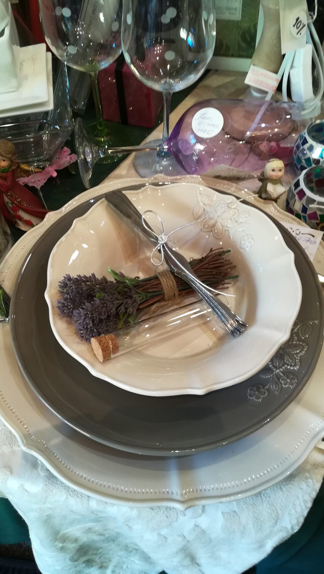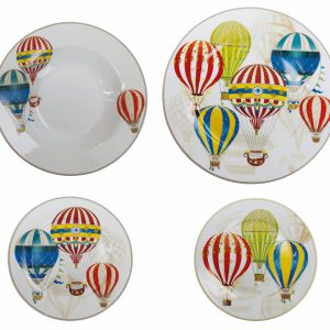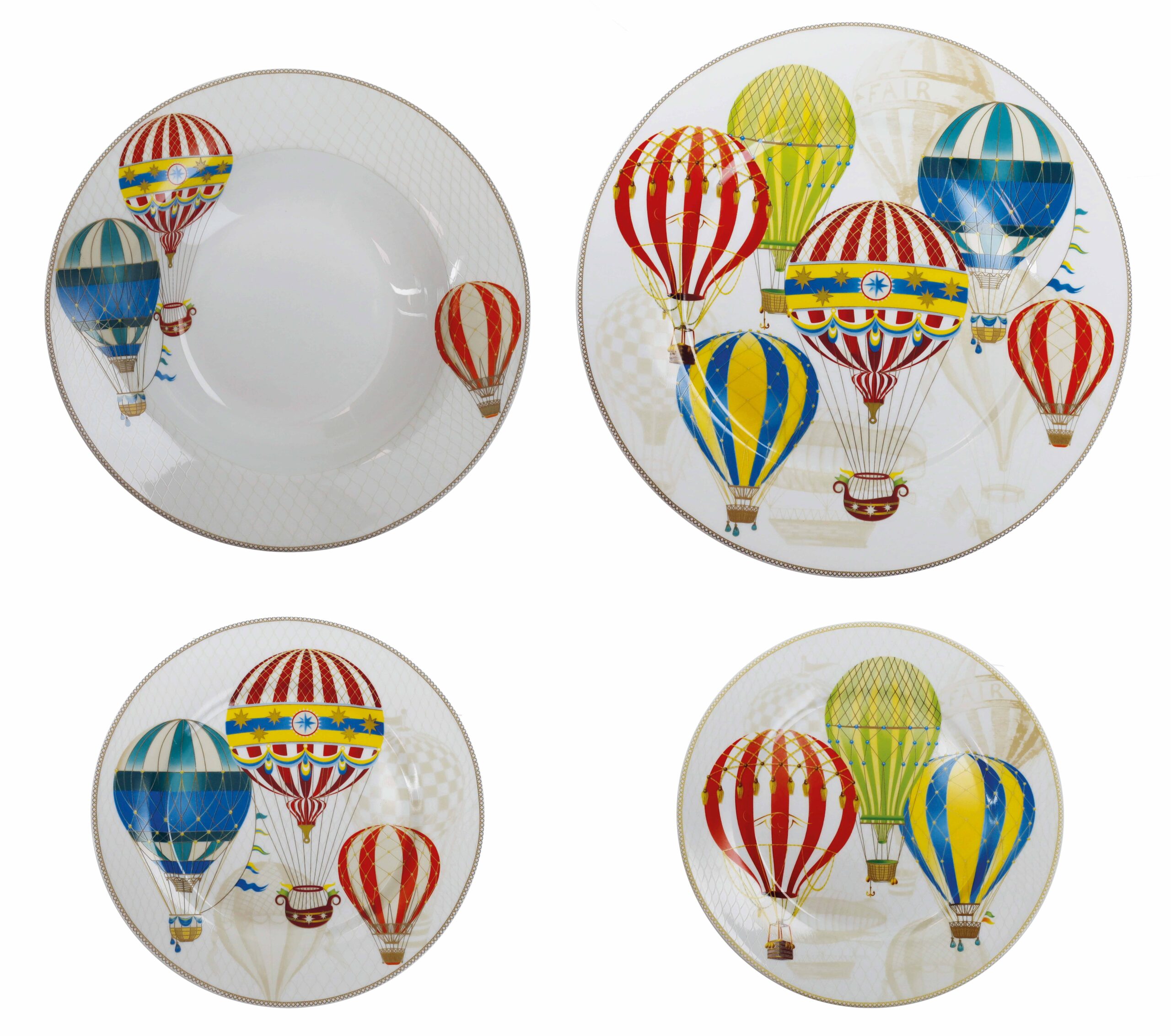 Vajilla de porcelana completa con seis servicios: seis platos llanos, seis platos hondos y seis platos de postre. Disponibles tazas a juego.