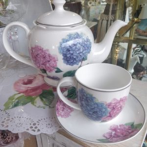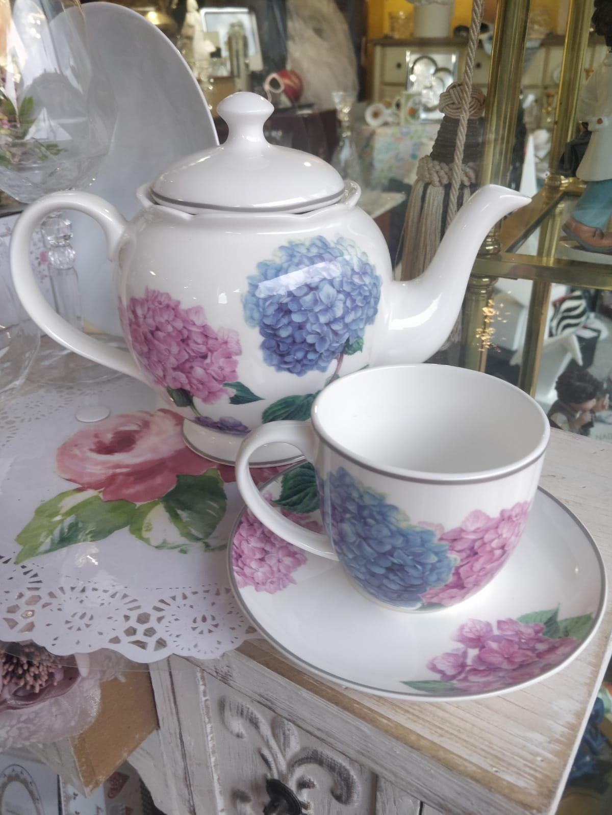 Tetera de porcelana, con opción de taza y platito para infusión.