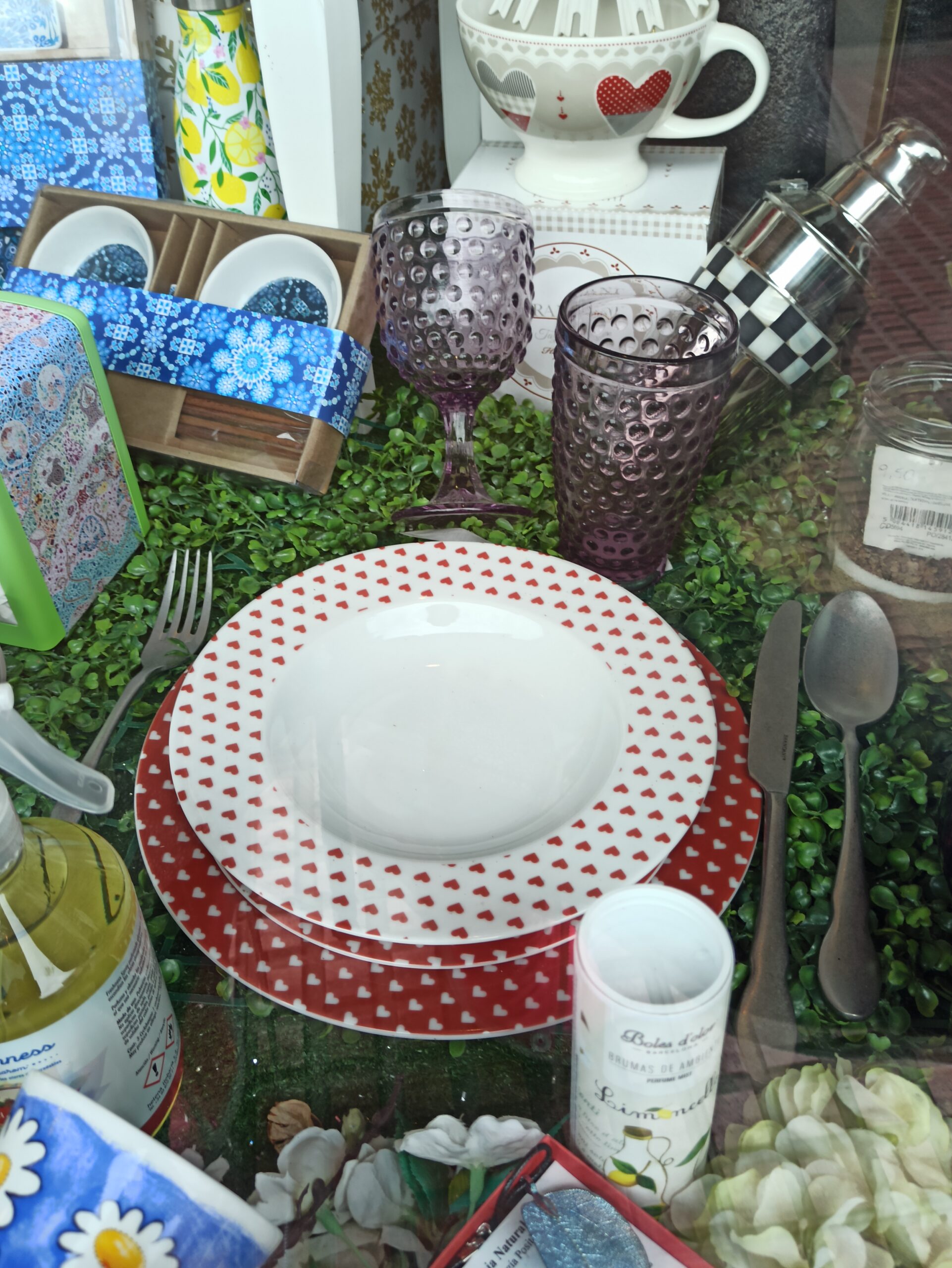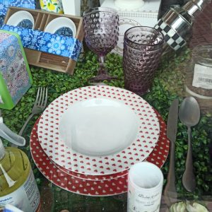 Vajilla de porcelana combinada a la perfección en dos tonos, blanca y roja. Compuesta por 18 piezas; seis servicios completos de platos de postre, platos llanos y platos hondos.
