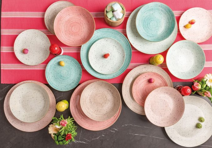 Vajilla de porcelana completa con seis servicios: seis platos llanos, seis platos hondos y seis platos de postre.