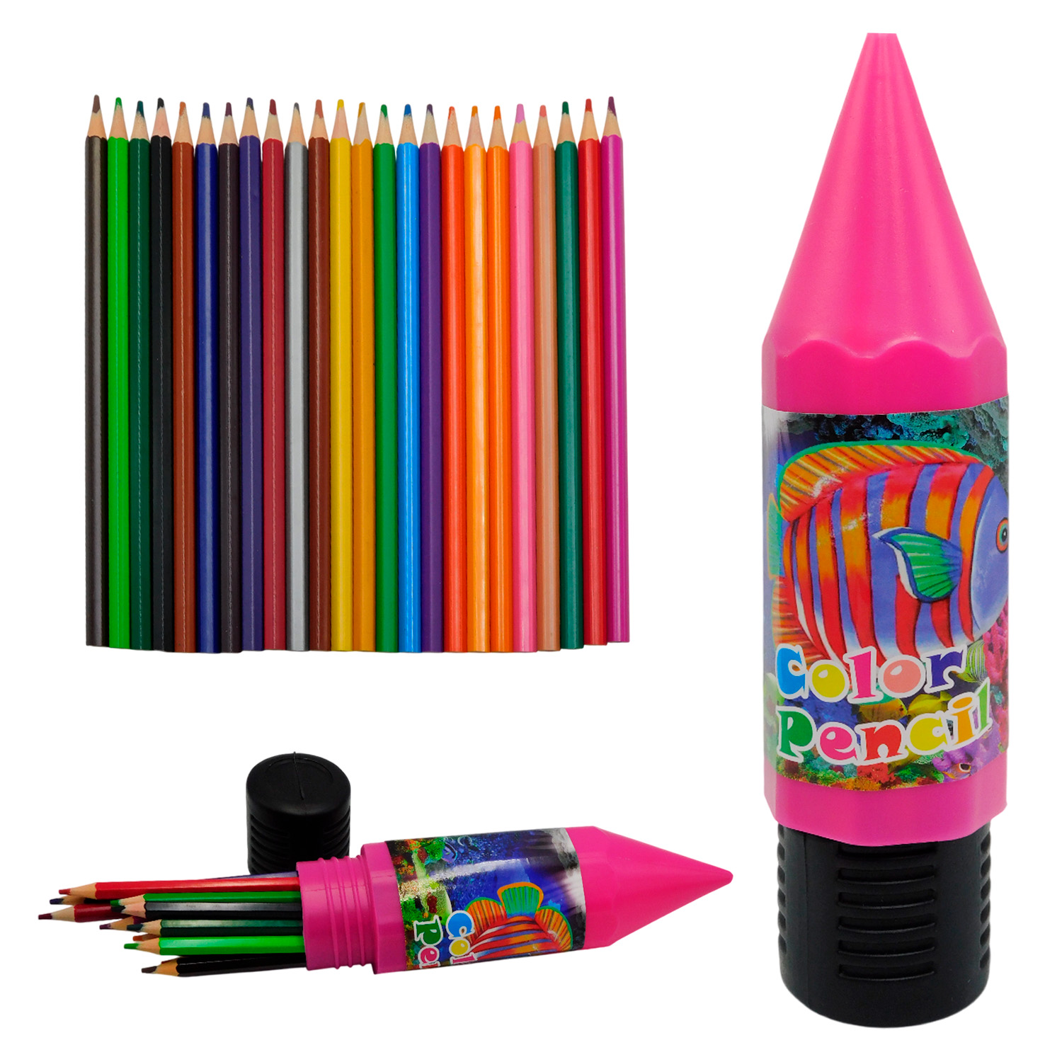 Estuche rígido con 24 lápices de colores surtidos en un diseño original con forma de lápiz gigante. Práctico y divertido para niños.