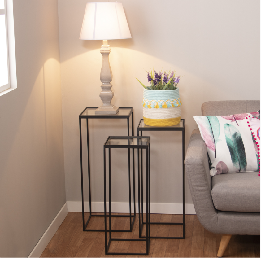Conjunto de dos mesas en hierro y cristal.