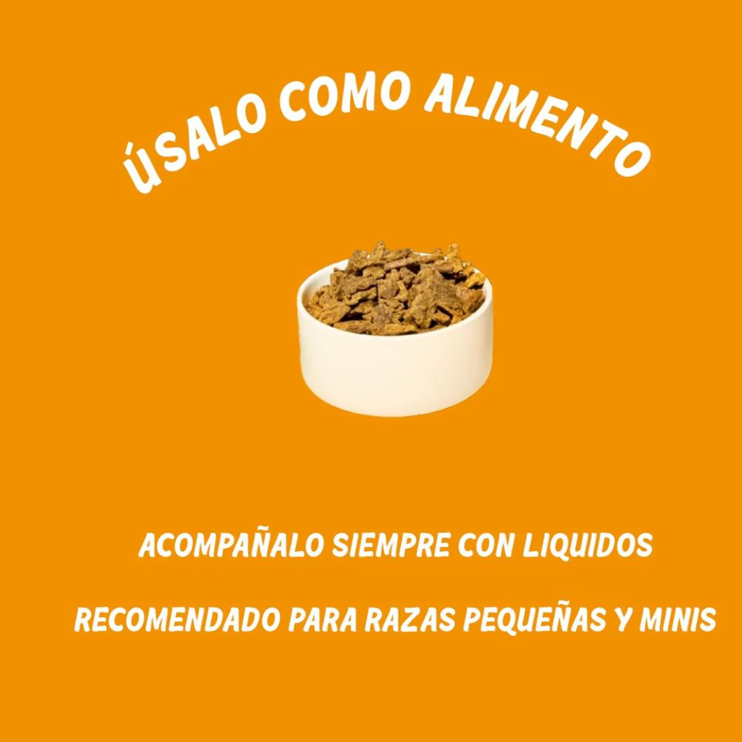 - Aporta una mayor cantidad de nutrientes a la dieta cuando se añade a croquetas u otros alimentos ultra procesados.