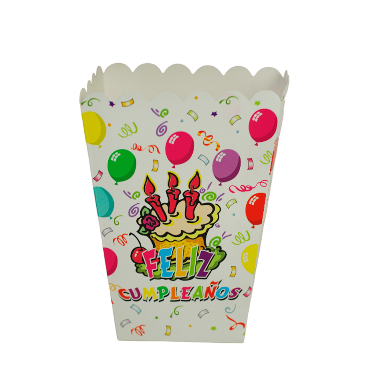 En forma de cartón clásico para palomitas llega esta fascinante dulcera con 6 piezas con el mismo diseño, con 13cm de alto 9cm de Larco en la parte superior, y 6cm de ancho en la parte superior.
