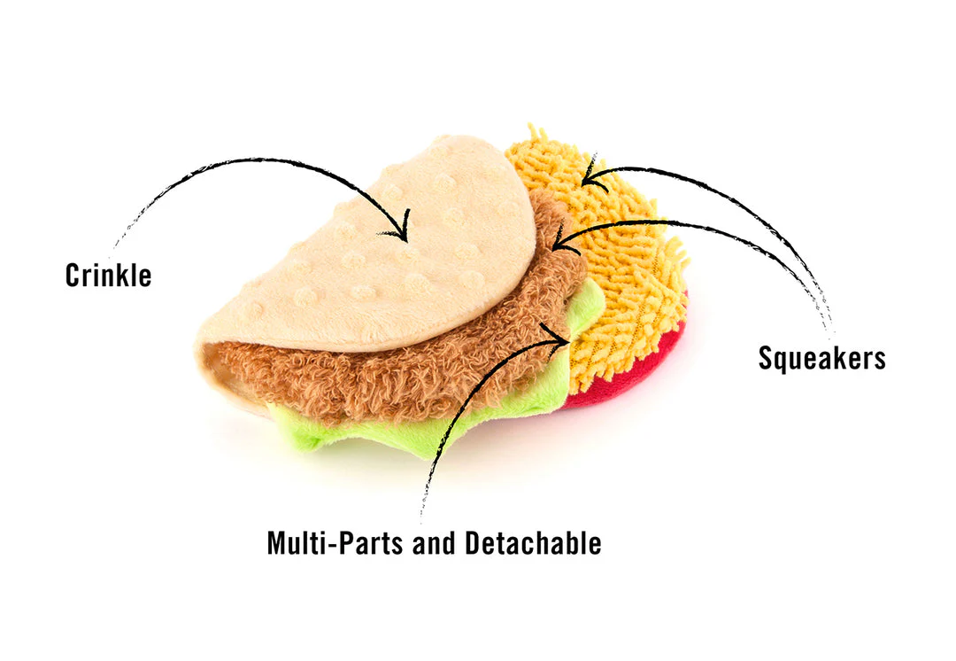 ¡Haz que tu perro disfrute de un auténtico banquete mexicano con el Taco Tail Waggin’ Taco de Peluche para Perros de P.L.A.Y.! Este delicioso y divertido juguete en forma de taco está diseñado para que tu peludo lo muerda, sacuda y juegue durante horas. Con colores vibrantes y texturas interactivas, este taco es ideal para todos los amantes de los juguetes inspirados en comida.