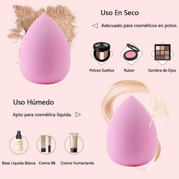 - Aplicación Uniforme: La esponja está diseñada para distribuir el maquillaje de manera uniforme sobre la piel, proporcionando una cobertura impecable y sin líneas visibles. Ideal para bases líquidas, correctores y otros productos en crema.