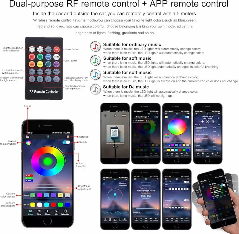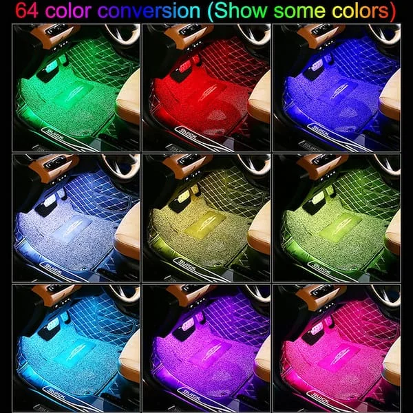 Transforma tu experiencia de conducción con nuestras luces LED RGB multicolor para auto. Con 64 colores vibrantes para elegir, podrás crear el ambiente perfecto en el interior de tu vehículo, ya sea para una noche de fiesta o un viaje tranquilo.