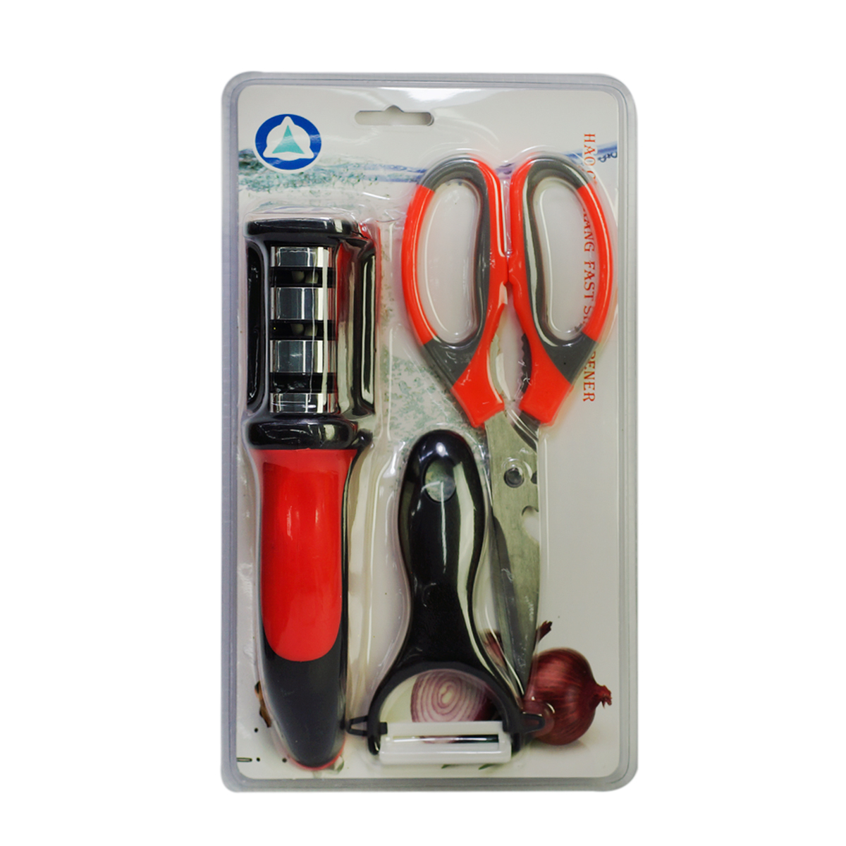Este kit está diseñado para hacer más sencilla y eficiente la labor en la cocina, ofreciendo tres utensilios indispensables en un solo paquete. La tijera cuenta con mango cómodo y seguro, ideal para cortar carne, verduras o empaques. El pelador tiene cuchilla afilada que reduce el esfuerzo y permite obtener cortes finos en pocos segundos. El afilador mantiene los filos en óptimas condiciones, prolongando la vida útil de las herramientas.
