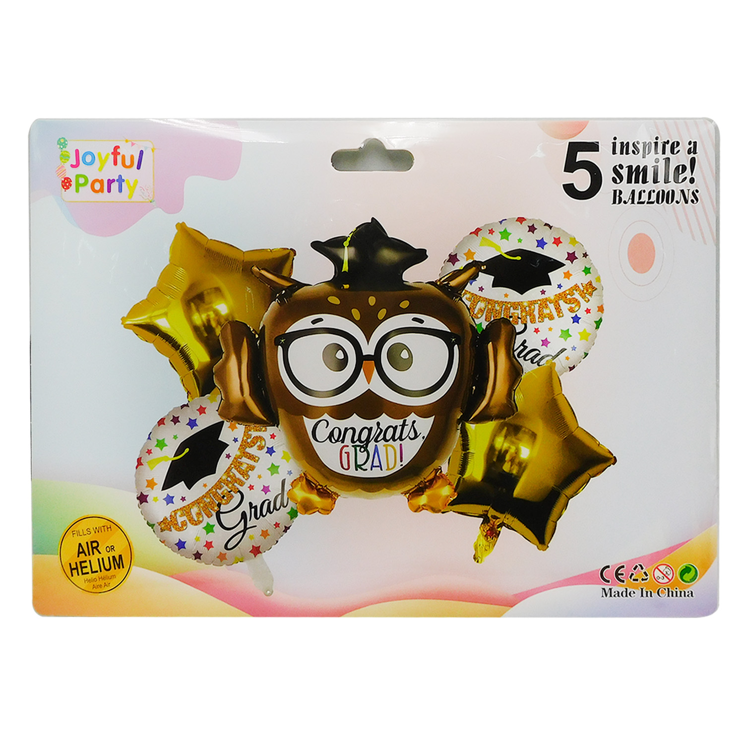 El kit incluye cinco globos con diferentes diseños y mensajes alusivos a la graduación, como “Felicidades Graduado(a)”, birretes y estrellas, todos pensados para reforzar la temática académica de la celebración. Los colores pueden incluir combinaciones clásicas como dorado, negro, blanco o plateado (sujetos a disponibilidad), lo cual permite una decoración versátil para distintos niveles educativos y estilos de fiesta.