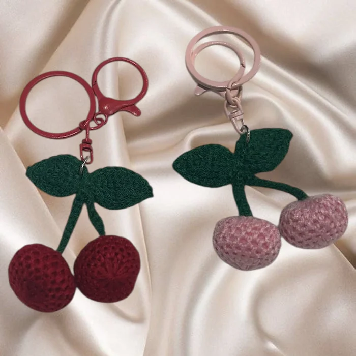 Llavero de crochet de cereza, disponible en rojo y rosa, bonito y de excelente calidad, perfecto para darle un toque dulce y original a tus llaves o mochila.