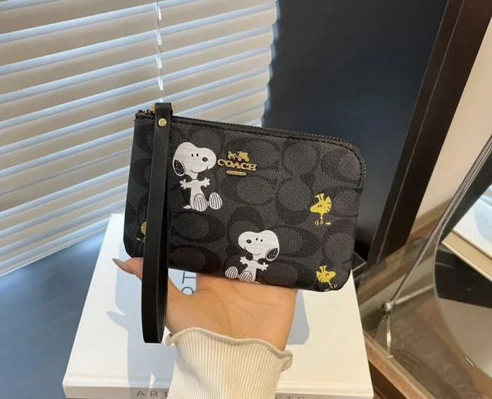 Cartera de un cierre con práctica tira muñequera, disponible en varios estampados y colores. De buena calidad, compacta y funcional, perfecta para llevar lo esencial con estilo.