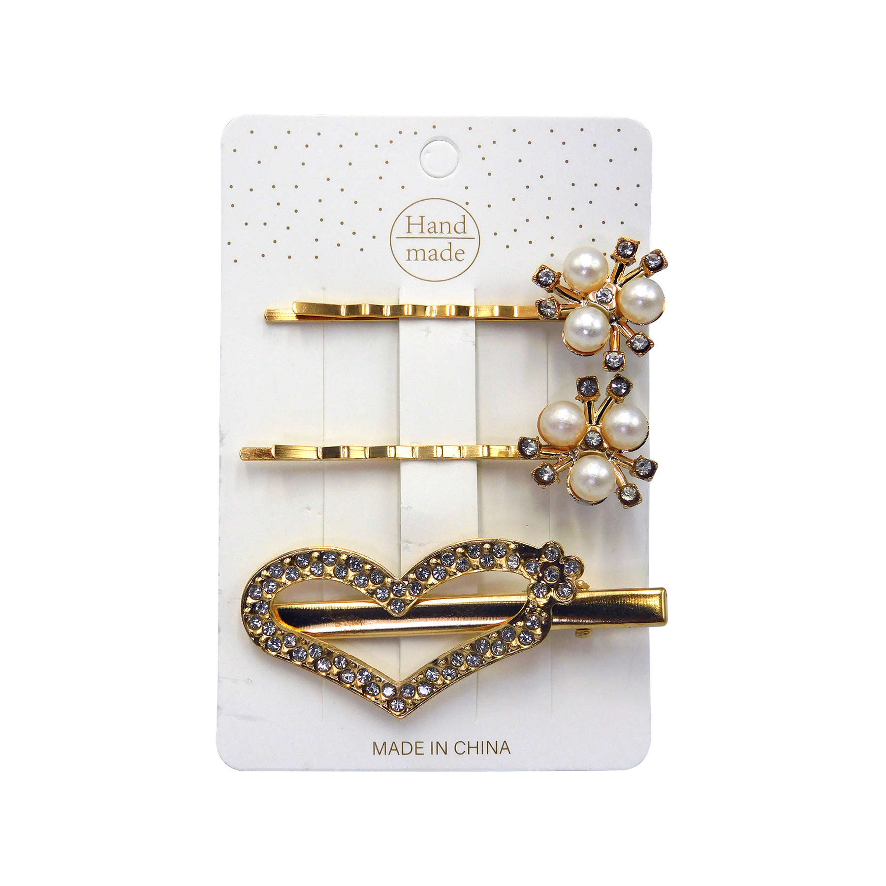 Cada set incluye 3 pasadores dorados con perlas sintéticas.