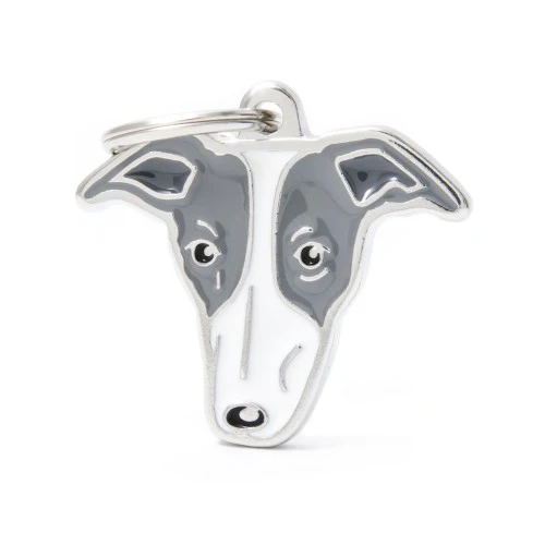Los galgos, como el elegante Whippet, destacan por su porte refinado y gracia natural. Esta placa en tono gris refleja su perfil esbelto y noble, aportando un aire de distinción cada vez que camina.