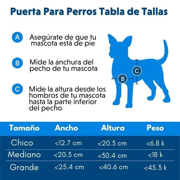 Tenemos 3 medidas de puerta, lo primero que necesitamos hacer es Medir a Nuestros Perros como lo Indica la siguiente Imagen.