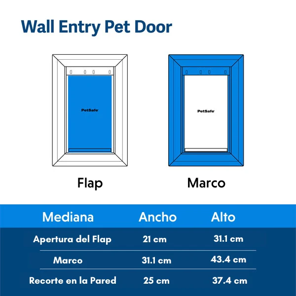 Aparte del marco cuenta con una puerta flexible, le llamamos «Flap», esté flap está entintado y es ajustable. El flap cuenta con cierre magnético lo que hace que cuando tu perro no esté pasando usando la puerta el flap cierre completamente impidiendo la entrada de tierra, calor, frío moscos, mosquitos, etc.