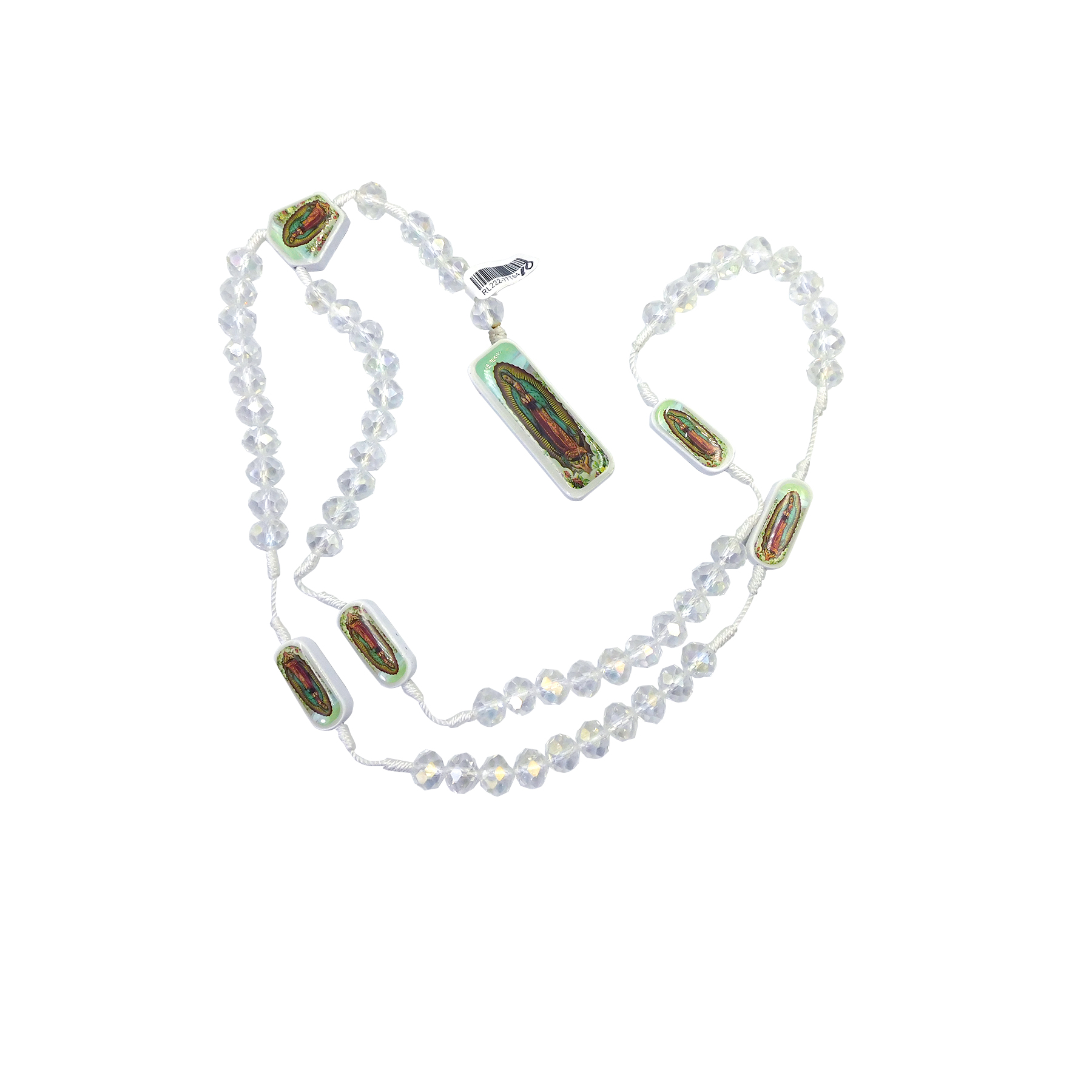 Rosario en con cristales color Blanco brillante separador de madera con imágenes de la virgen.