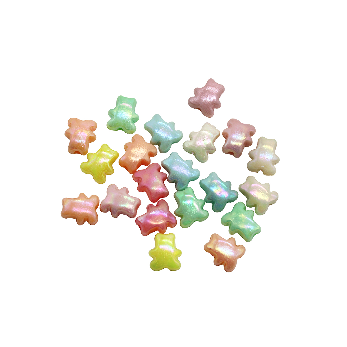 El separador osito tornasol es una pieza encantadora para proyectos de bisutería. Se presenta en paquete de 250 gramos con colores pasteles surtidos. Cada separador tiene forma de osito y un acabado tornasol que refleja la luz. El efecto cambia según el ángulo, aportando dinamismo a tus piezas.