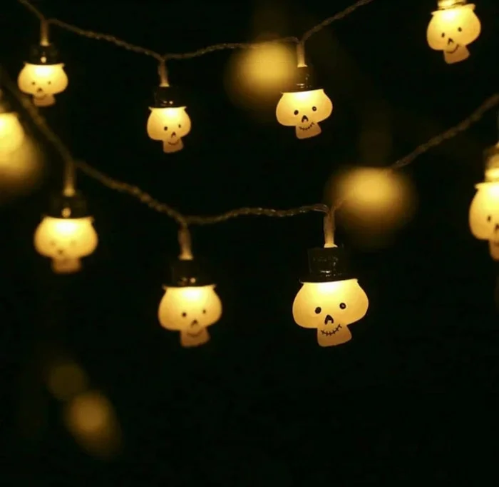 Serie de 1.5 mts da un toque especial a tu celebración de Halloween y Día de Muertos con la guirnalda de luces con cabezas de calaca.