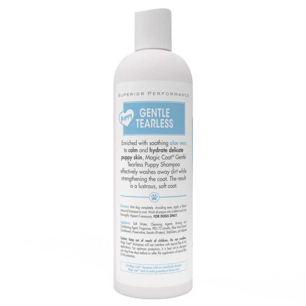 El Magic Coat® Gentle Tearless Puppy Shampoo está especialmente formulado para limpiar y cuidar la delicada piel de los cachorros. Gracias a su fórmula sin lágrimas y su contenido de aloe vera calmante, hidrata y protege la piel sensible mientras elimina suavemente la suciedad, dejando el pelaje limpio, brillante y con una textura increíblemente suave.