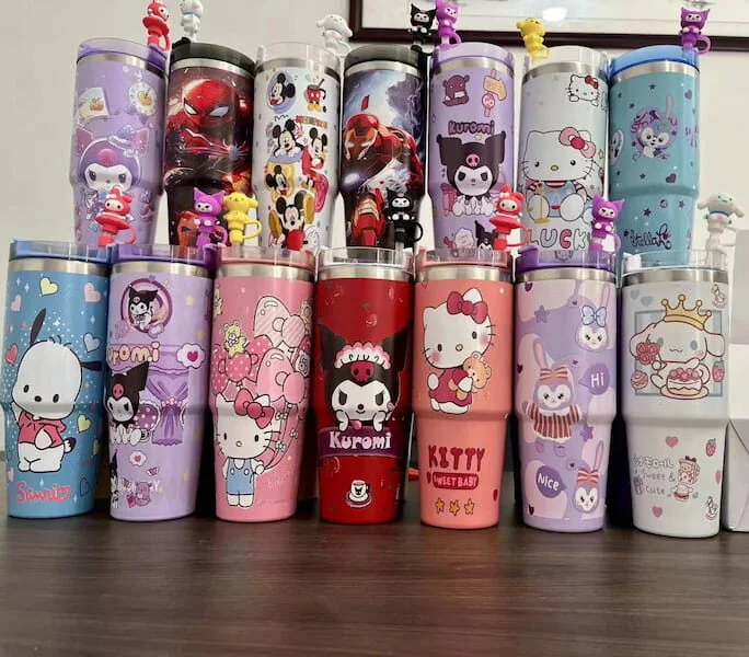 Invierte en un termo de 40 oz con diseño de personaje kawaii para combinar practicidad con encanto, asegurando que siempre tengas un compañero encantador para tus bebidas.