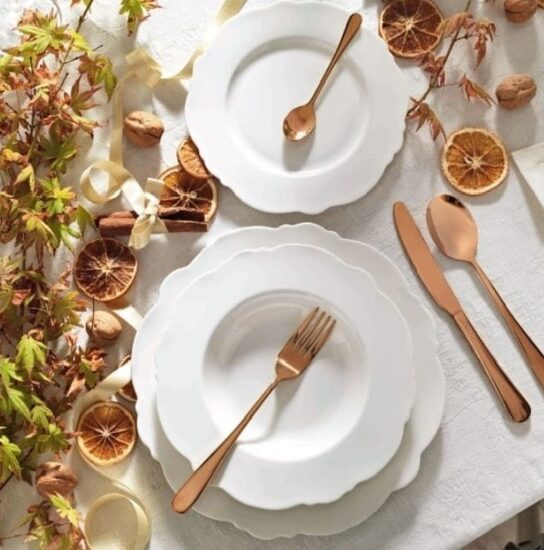 Vajilla de porcelana completa con seis servicios: seis platos llanos, seis platos hondos y seis platos de postre.