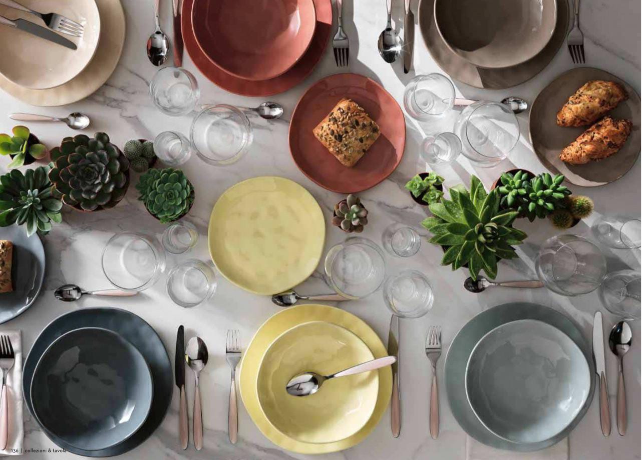 Vajilla combinada en tres colores con seis servicios: seis platos llanos, seis platos hondos y seis platos de postre. Dos platos de cada modelo que aparece en la fotografía.