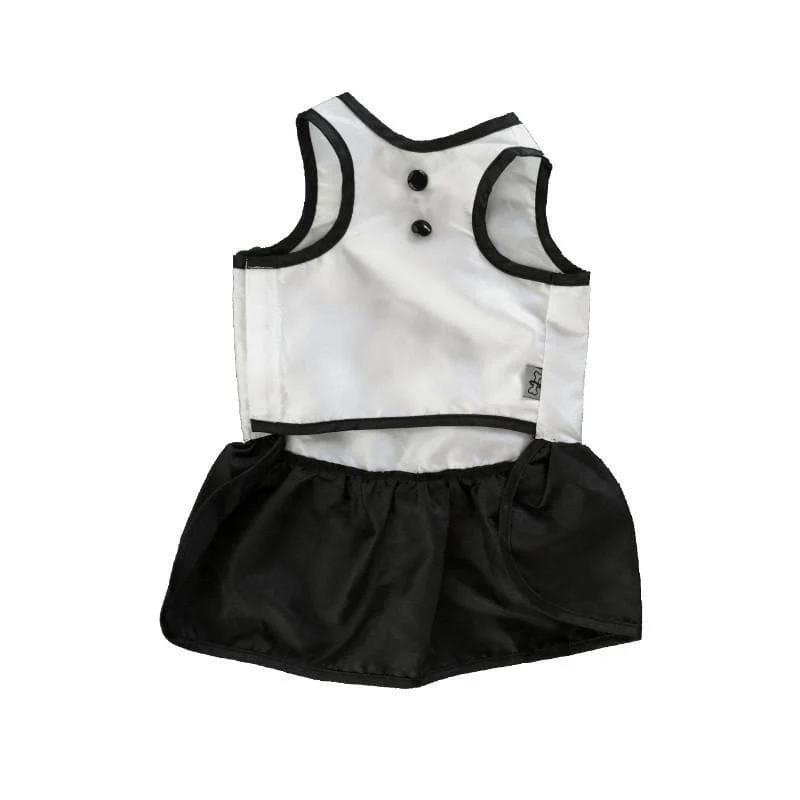 El vestido cuenta con un moño negro en la parte de atrás para darle un toque coqueto y elegante, es fácil de poner y de quitar gracias a el velcro que va por un costado.