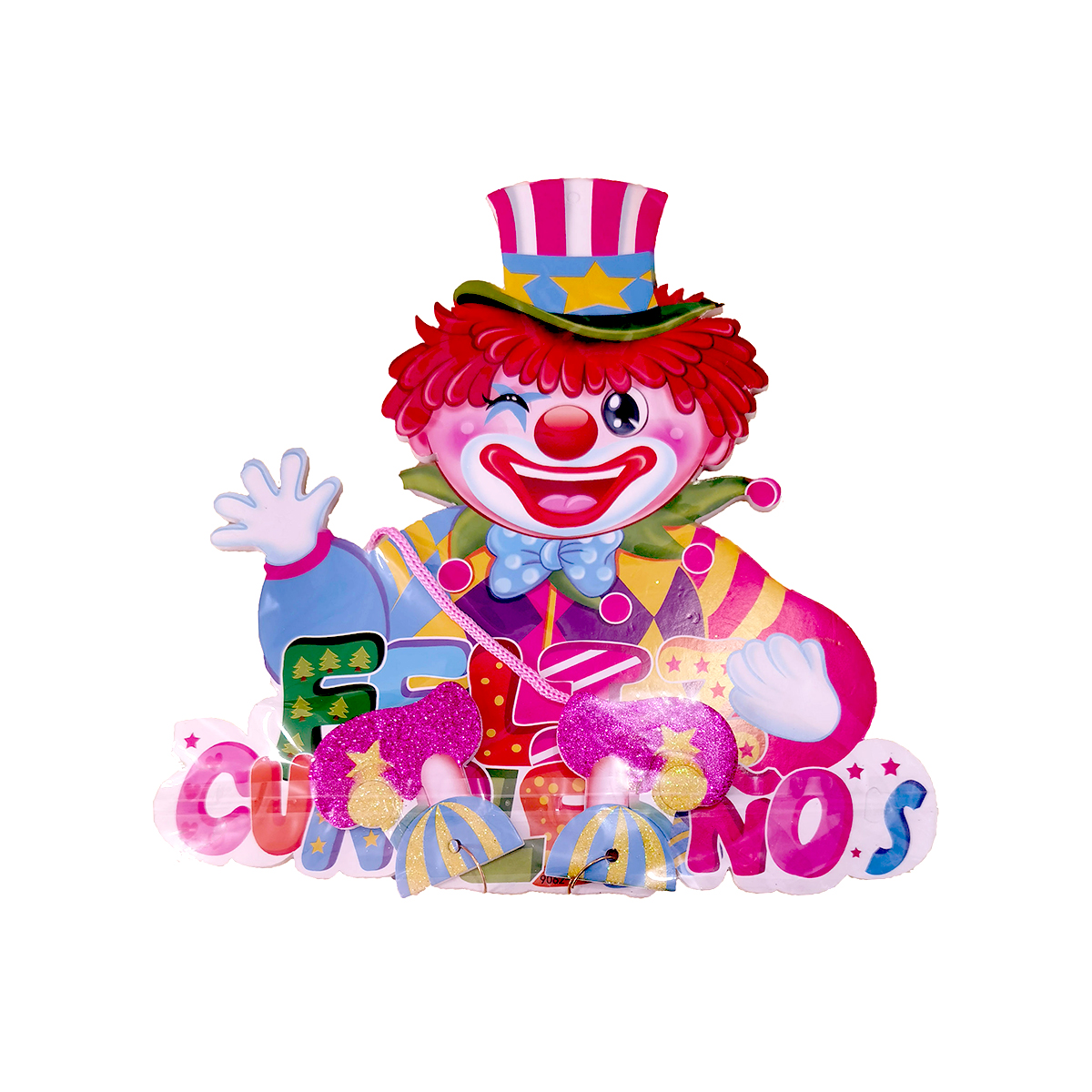 Letrero de cartón con diseño de payaso y leyenda “Feliz Cumpleaños”, ideal para fiestas infantiles.