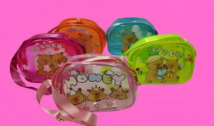 Bolsa transparente con diseño de capibara, incluye tira para colgar. Práctica y divertida, ideal para llevar lo esencial con estilo.