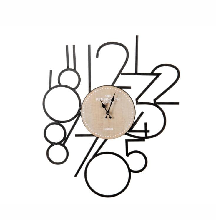 Reloj de pared estilo industrial en madera y metal lacado en negro.