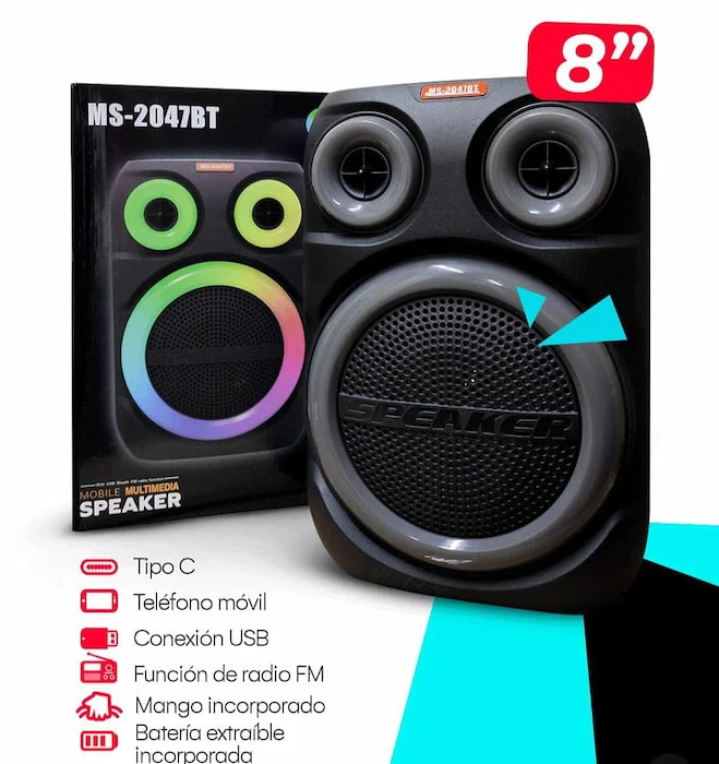 Bocina de 8″ con luz LED, modelo MS-2047BT. Potente sonido y efectos de luz dinámicos, ideal para fiestas y eventos. Con conexión Bluetooth para disfrutar de tu música de manera inalámbrica.