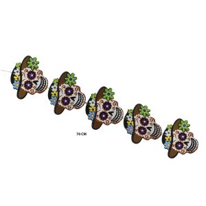 Guía decorativa con figuras de calavera. Ideal para paredes, puertas o fiestas de Halloween. Colorida, ligera y fácil de colocar.