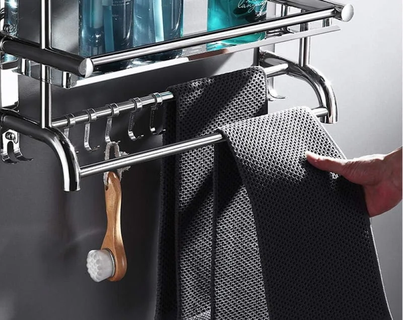Toallero montado en la pared, elegante y funcional, fabricado en acero inoxidable pulido. Incluye un estante de tres capas y ganchos adicionales, ofreciendo un soporte robusto y versátil para múltiples toallas. Ideal para mantener tu baño organizado y con estilo. Medida de 40 cm.
