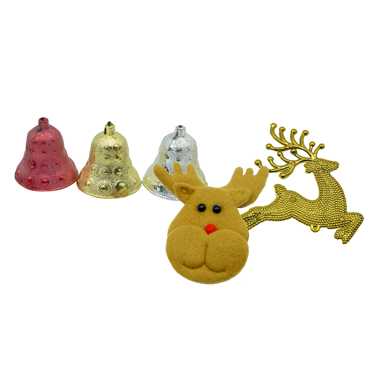 Set de 6 campanas navideñas con personaje de fieltro decorativo.