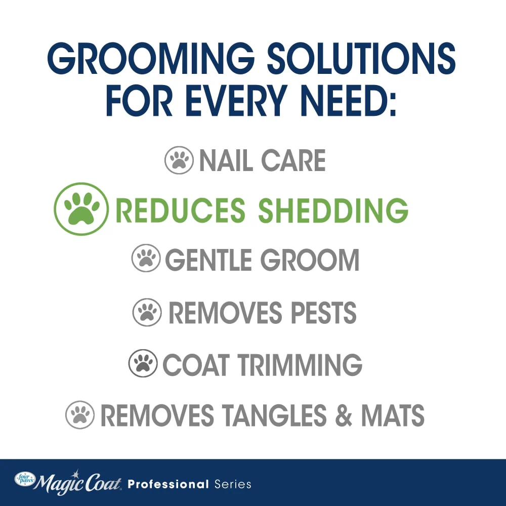 El Magic Coat® Professional Series Pro-Shedder + Dematter es una herramienta innovadora todo-en-uno diseñada para eliminar el pelo suelto, los nudos y los enredos más difíciles del pelaje de tu perro sin causar irritación en la piel. Ideal para perros con pelaje medio, largo o rizado.