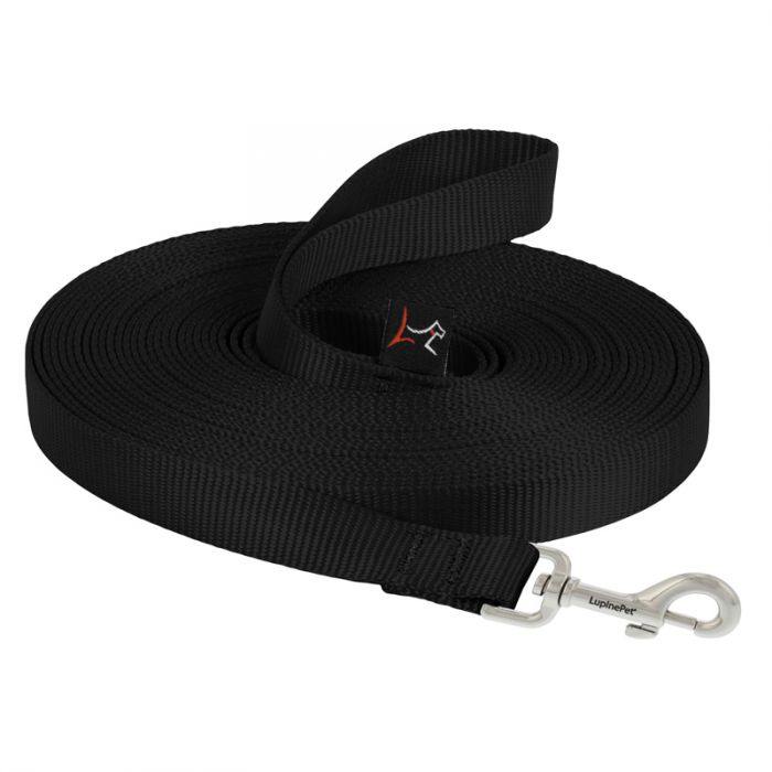Esta es una correa de adiestramiento duradera fabricada en Nylon con un ancho de 1.9 cm y con dos opciones de longitud de 4.5 y 9 metros.