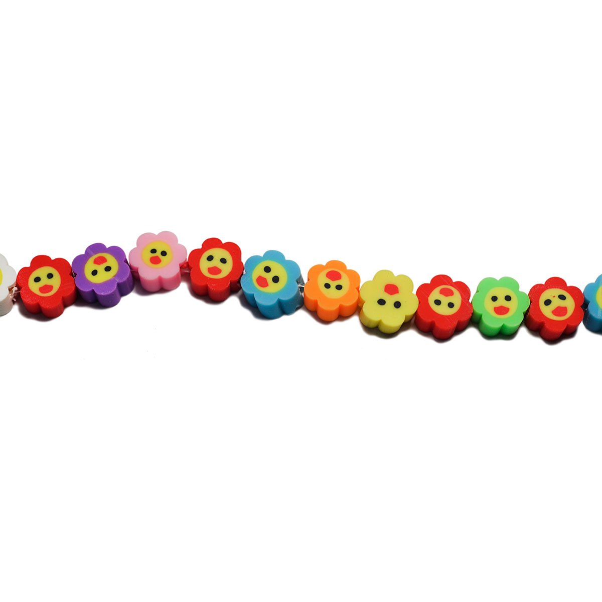 Agrega un toque divertido y colorido a tus creaciones con este encantador hilo de cuentas de fimo de flores con caritas. Cada hilo incluye aproximadamente 40 piezas elaboradas en fimo de alta calidad, diseñadas en forma de flor sonriente con una gran variedad de colores vibrantes. Estas cuentas son perfectas para dar vida a pulseras, collares, llaveros y todo tipo de accesorios hechos a mano.